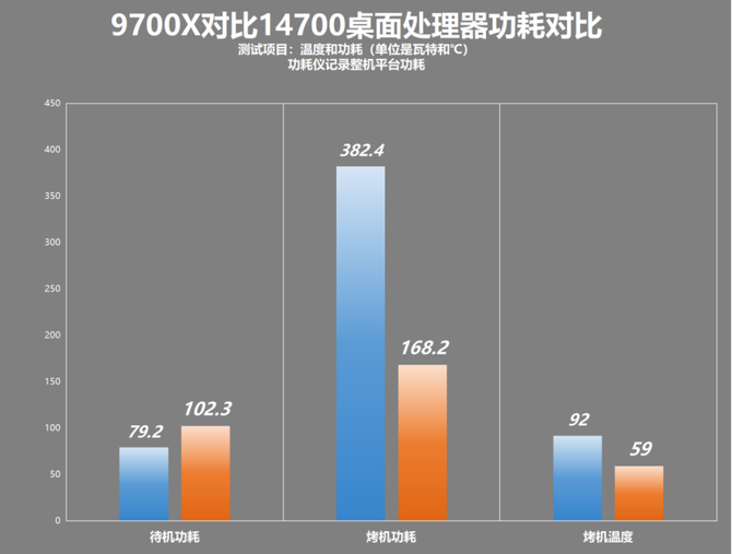 后面我们使用AIDA64对两款处理器进行功耗和温度的测试,并且使用功耗仪记录整个平台的功耗,从上面可以看到,在满载FPU烤机的状态下,14700K的功耗来到了382.4W,而锐龙7 9700X的功耗仅为168.2W,两款处理器的功耗差距非常巨大。