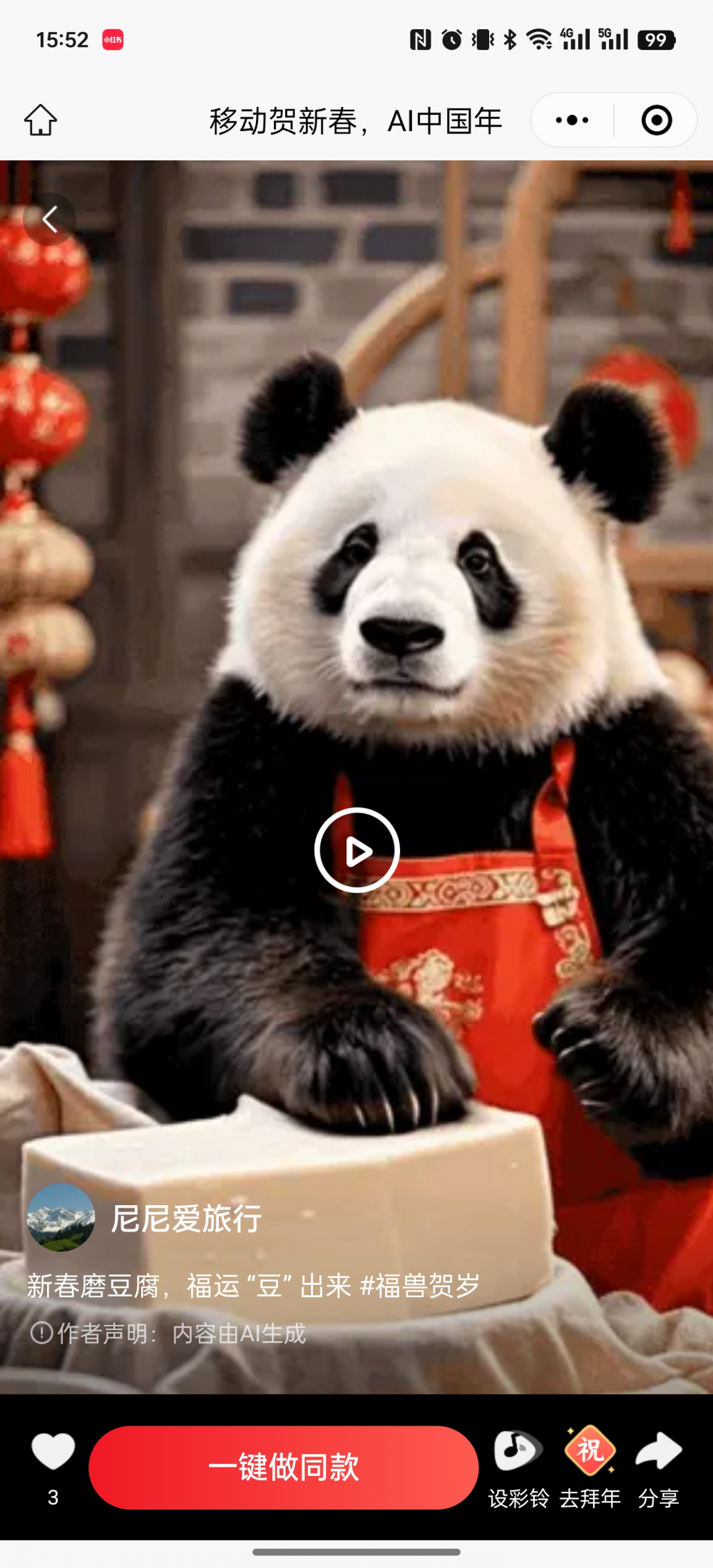 除此之外,中国移动还推出了AI一笔成画、AI一图炫舞、AI一图妙影等超30款AI创新应用、1000套精品模板,以AI新质技术创新表达祝福、体验非遗,让人人都能通过AI智创彩铃成为非遗的创作者、传播者。