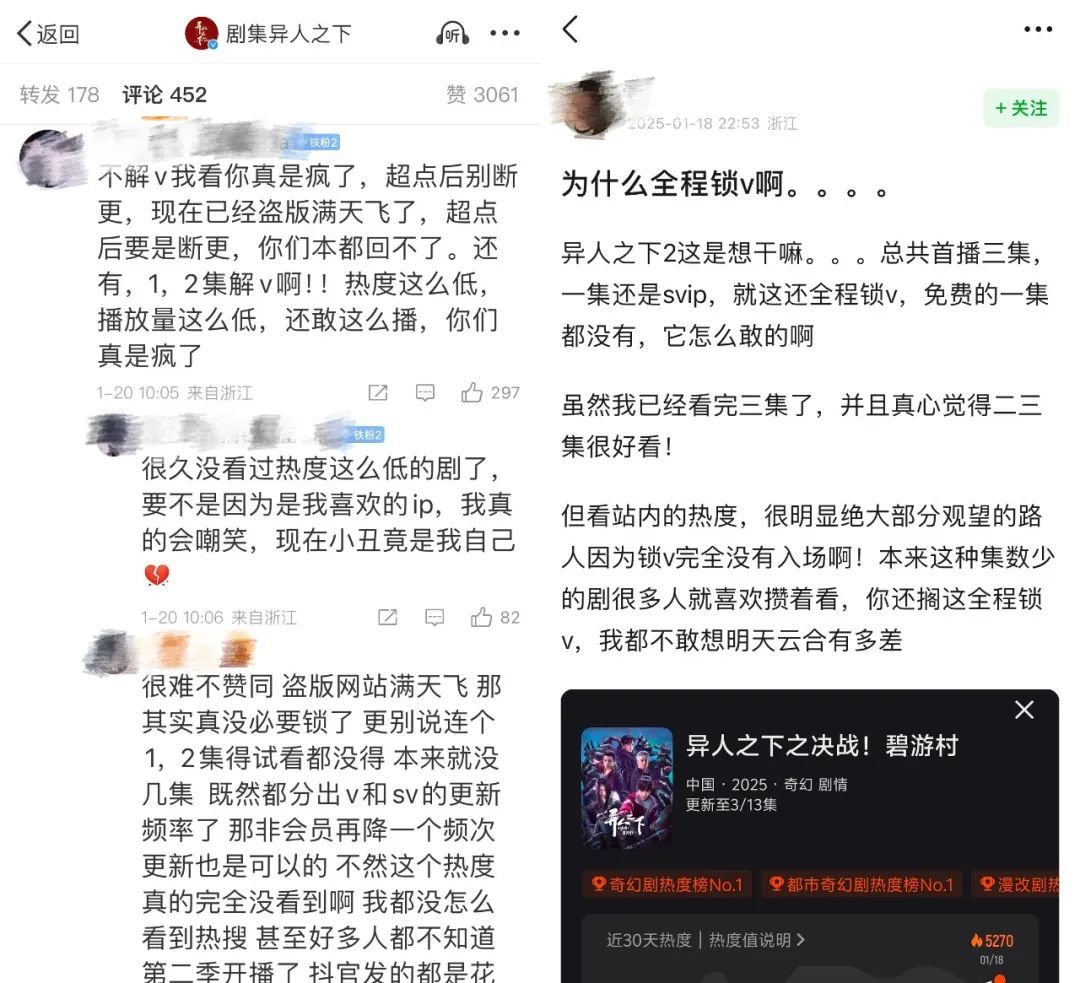 对于非粉观众来说,锁V成为了入场的直接障碍,有些可能决定多观望几集,有些则直接网盘见。这不仅意味着正版观众流失,更意味着热度上涨缓慢,令剧集精神股东、年轻主演粉丝都难掩焦虑。