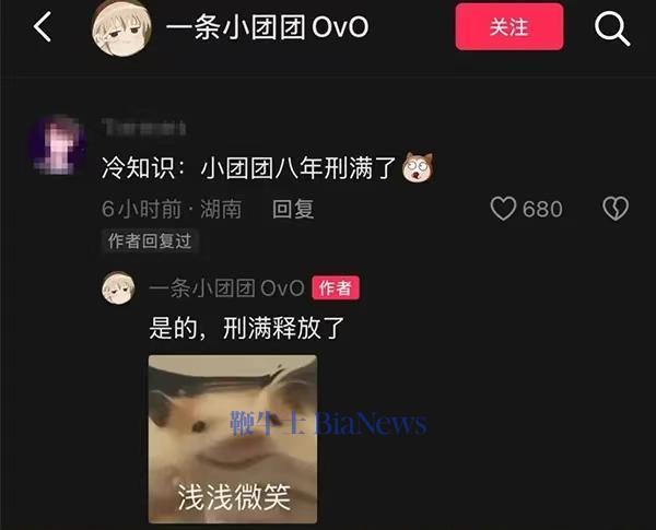 鞭牛士 1月24日消息,近日,知名游戏主播小团团账号复活,现身评论区回复网友关于被捕的调侃,小团团则回复称:“是的,刑满释放了。”
