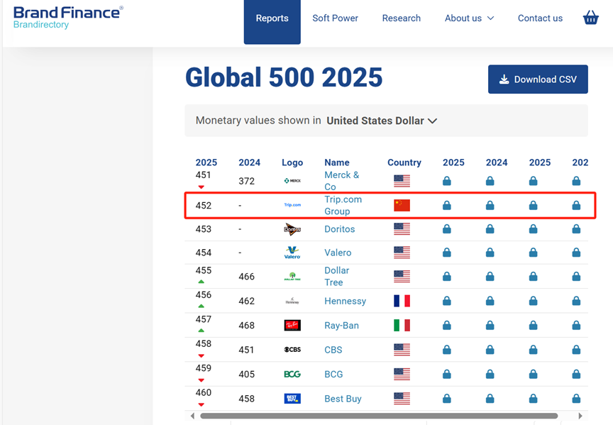 日前,《Brand Finance 2025年全球品牌价值500强榜单报告》在瑞士达沃斯发布。报告显示,携程集团入选该榜单,位列第452位。同时,携程是此次国内OTA行业唯一上榜品牌,在全球OTA类别中,携程品牌价值位列全球第三,在休闲与旅游类别中,携程位居全球第五。