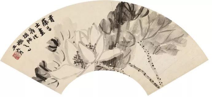 这是赵之谦于乙丑年三十七岁时所创作的作品,完整而漂亮。据笔者所知,十二帧一套的折扇,赵之谦一生中仅画此一套,极为珍稀。陶北溟题签:“金轮精舍铭心绝品”,可见其心爱至极。著名艺术大师启功先生于1992年在香港观看此十二帧扇面后大为赞叹,并题云:“浩劫平生恨,悲翁苦自悲。文章多兀奡,画法最灵奇。矫矫东方讃,峨峨北魏碑。刚柔行与艺,俗眼莫相疑。悲盦早岁丁东南浩劫,平生磊落每于笔墨中见之。其书其印,世所习见。书拟魏刻,或以姿媚少之,非真鉴也。画笔灵奇,魄力雄伟,虽写巨幛,如挥尺素。而此便面十二叶,一一有寻丈之观,真绝妙之迹,绝妙神品。今年香江之游,属有眼福,屡见精美之作。然未有能及此册之奇者,击节之余,特为表而出之。壬申孟夏,坚净翁启功行年八十。”启功先生观画时的喜形于色,仿佛就在眼前。