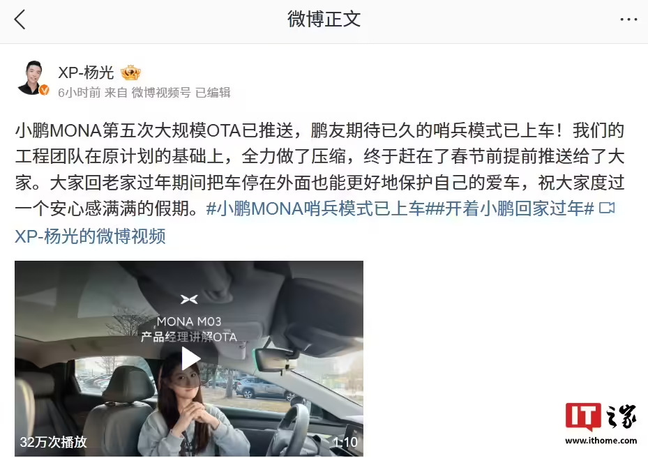 小鹏汽车 MONA 产品负责人 @XP-杨光 今日分享视频介绍了 MONA 车型的第五次大规模 OTA。