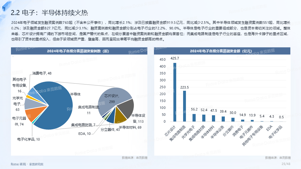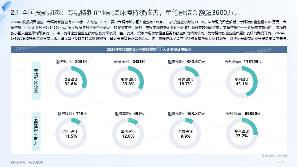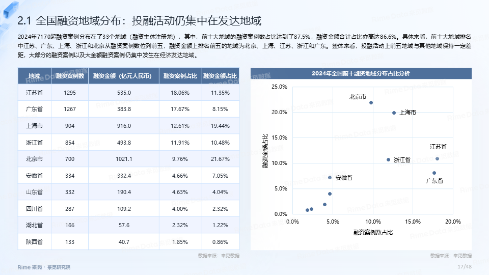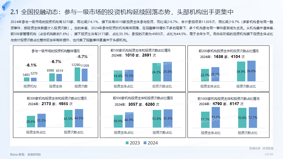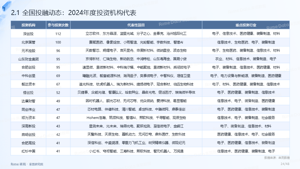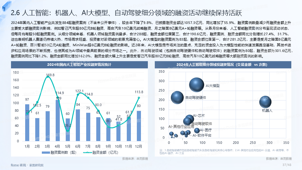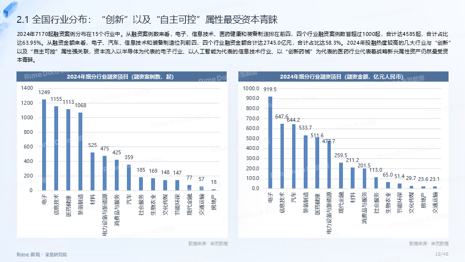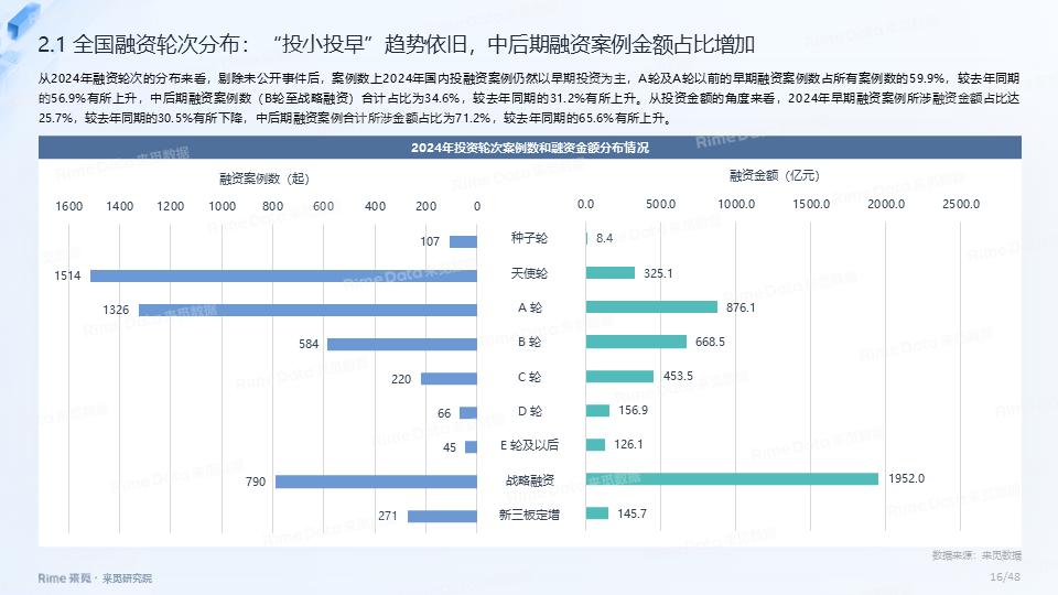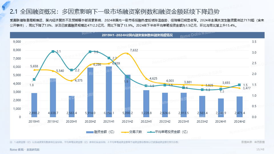 2024年全国共发生融资案例达7170起(含未公开事件),同比下降7.0%,涉及已披露融资规模达4712.2亿元,同比下降了13.9%。一级市场仍以“投早、投小、投科技”为主,A轮及A轮以前的早期融资案例数占所有案例数的59.9%。电子、信息技术、医药健康和装备制造融资案例数合计占比64.0%,电子、信息技术、汽车和装备制造融资金额合计占比58.3%。人工智能融资案例数884起,融资金额1057.3亿元,其中机器人、AI大模型、自动驾驶等细分赛道备受资本关注。2024年获投的专精特新企业有2035家,占比达32.6%,专精特新小巨人企业有719家,占获投企业总数的11.5%。
