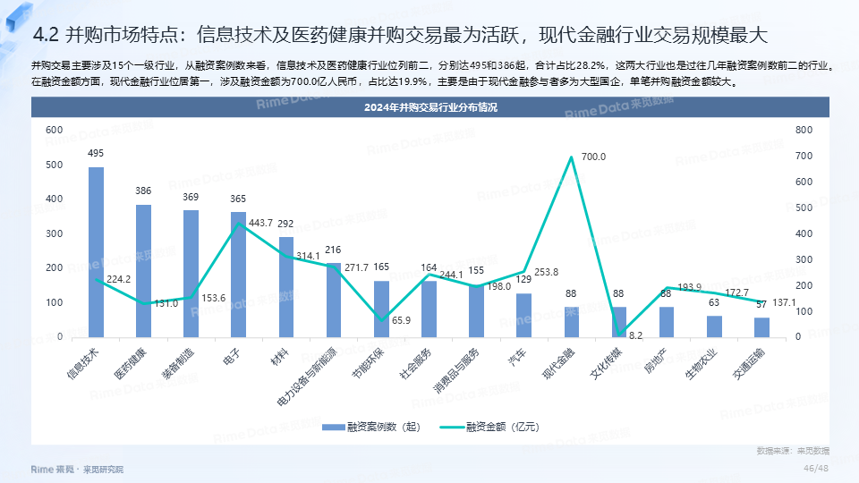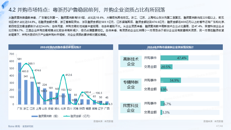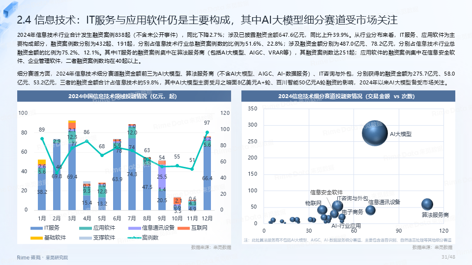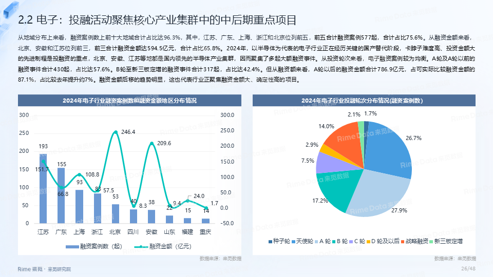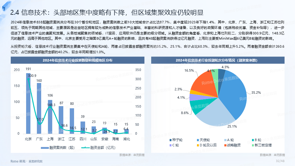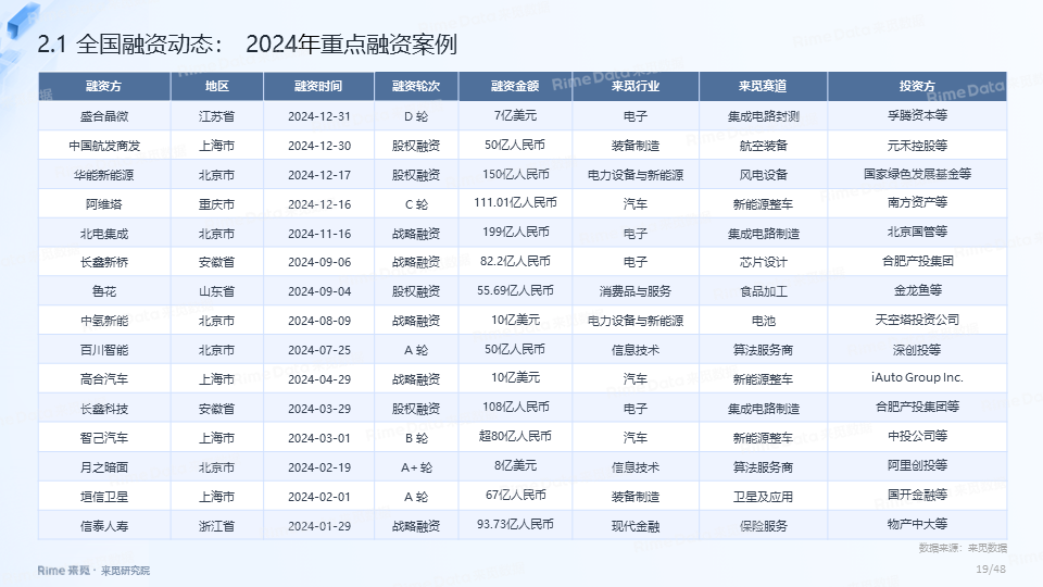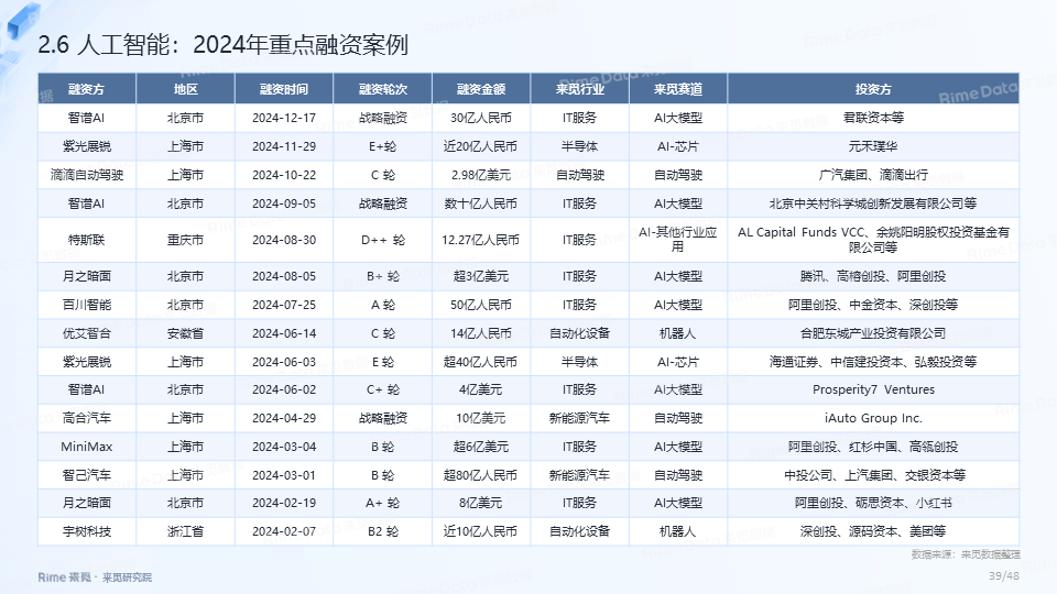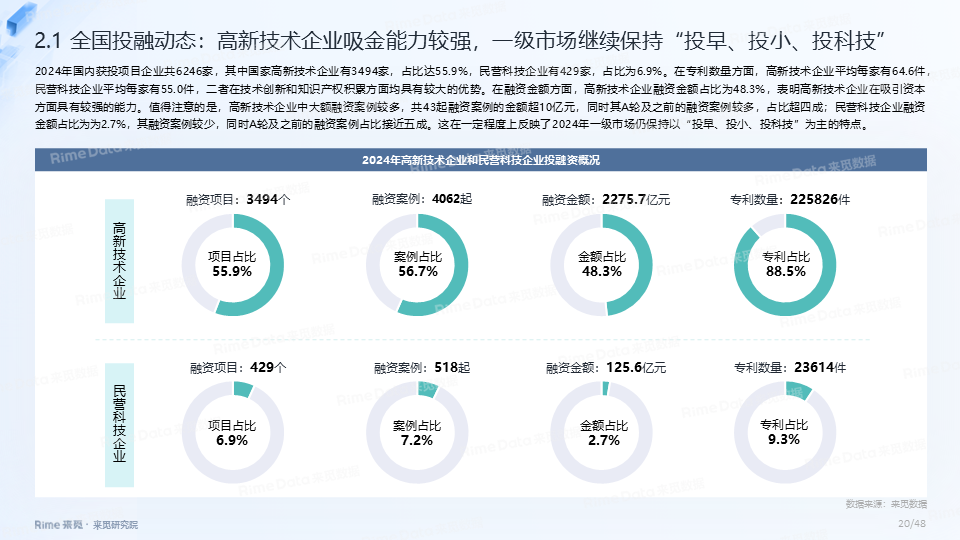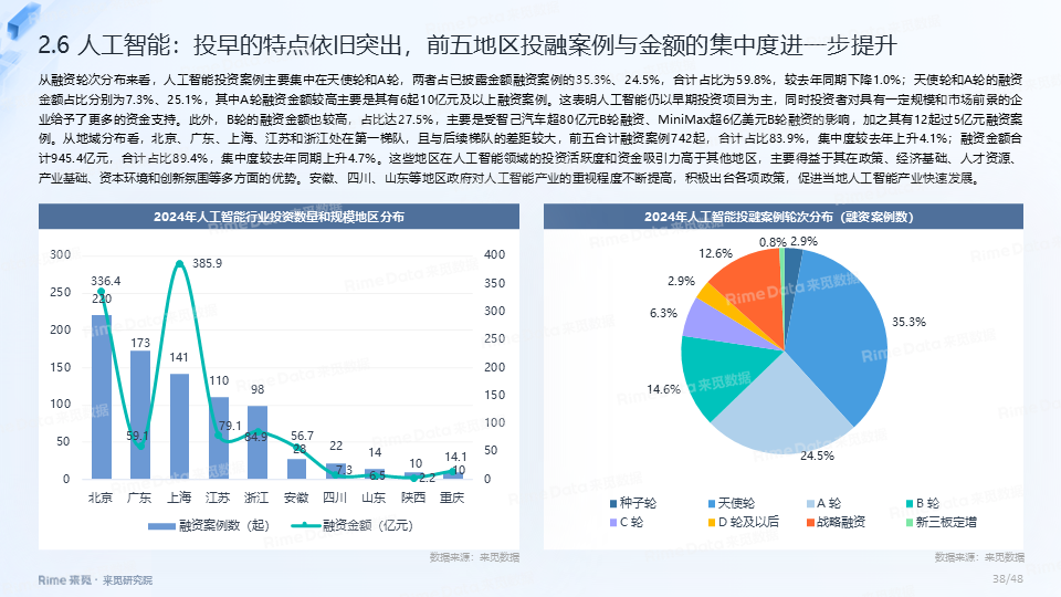 2024年全国共发生融资案例达7170起(含未公开事件),同比下降7.0%,涉及已披露融资规模达4712.2亿元,同比下降了13.9%。一级市场仍以“投早、投小、投科技”为主,A轮及A轮以前的早期融资案例数占所有案例数的59.9%。电子、信息技术、医药健康和装备制造融资案例数合计占比64.0%,电子、信息技术、汽车和装备制造融资金额合计占比58.3%。人工智能融资案例数884起,融资金额1057.3亿元,其中机器人、AI大模型、自动驾驶等细分赛道备受资本关注。2024年获投的专精特新企业有2035家,占比达32.6%,专精特新小巨人企业有719家,占获投企业总数的11.5%。