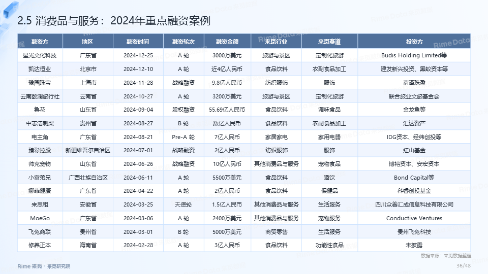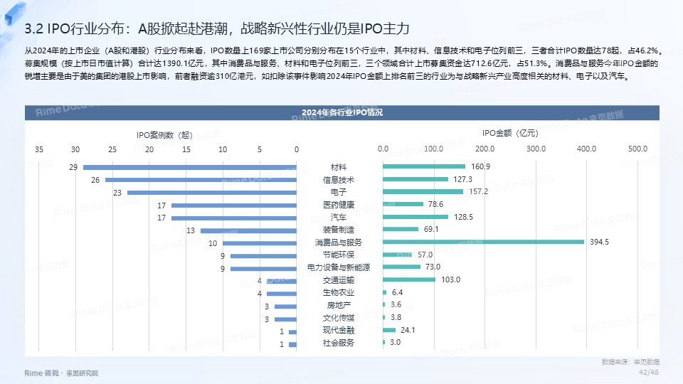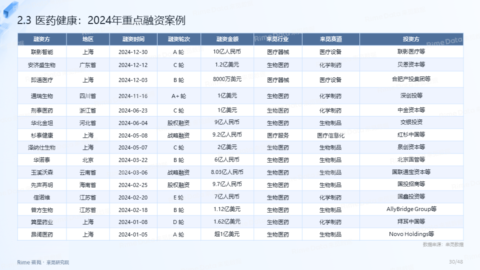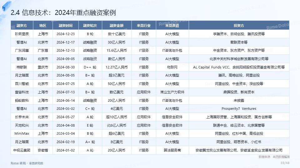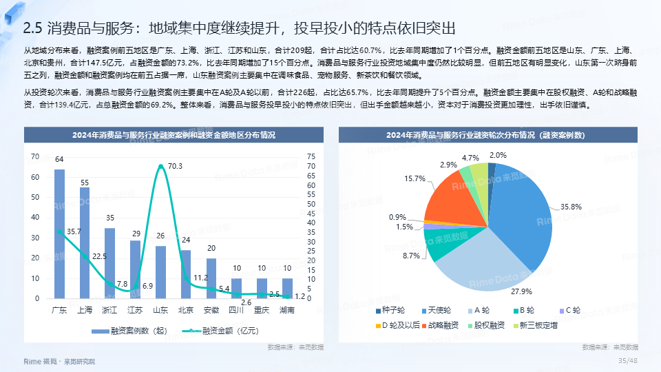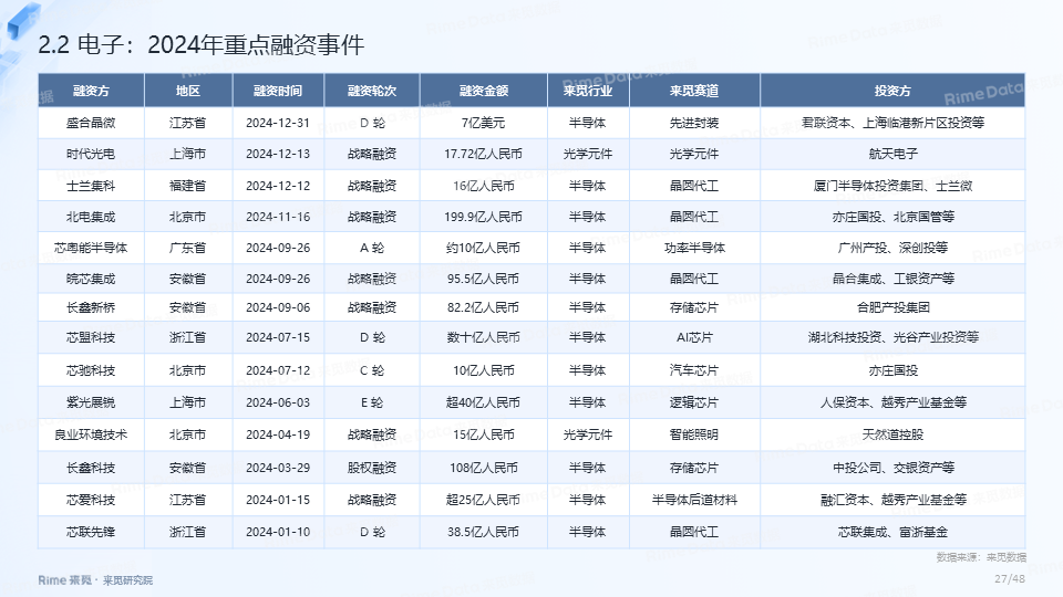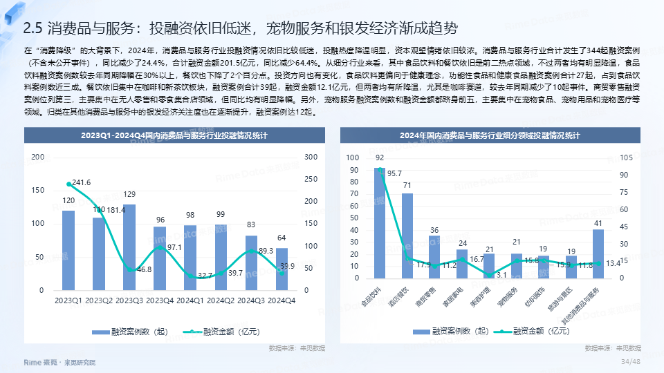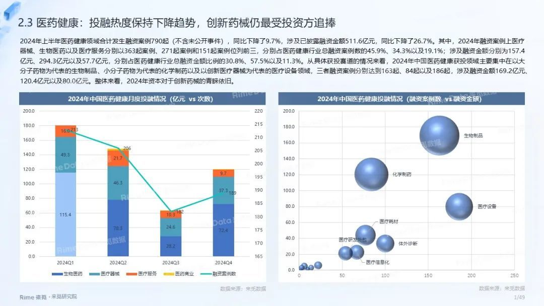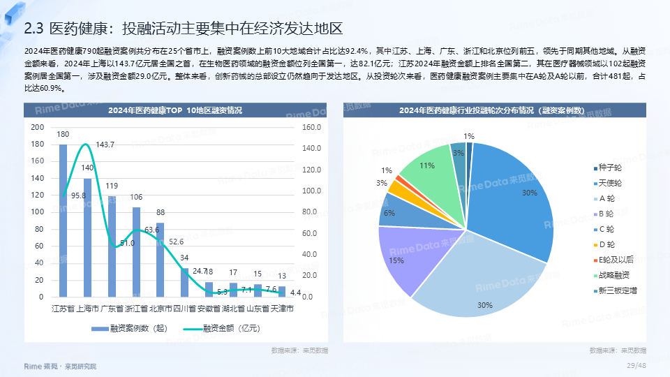 2024年全国共发生融资案例达7170起(含未公开事件),同比下降7.0%,涉及已披露融资规模达4712.2亿元,同比下降了13.9%。一级市场仍以“投早、投小、投科技”为主,A轮及A轮以前的早期融资案例数占所有案例数的59.9%。电子、信息技术、医药健康和装备制造融资案例数合计占比64.0%,电子、信息技术、汽车和装备制造融资金额合计占比58.3%。人工智能融资案例数884起,融资金额1057.3亿元,其中机器人、AI大模型、自动驾驶等细分赛道备受资本关注。2024年获投的专精特新企业有2035家,占比达32.6%,专精特新小巨人企业有719家,占获投企业总数的11.5%。