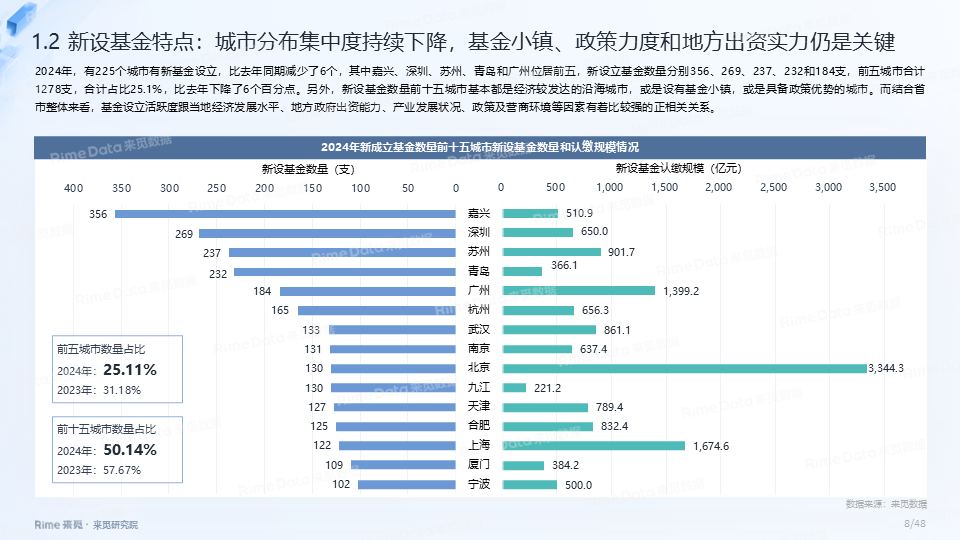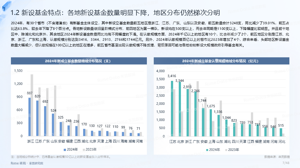 2024年新设私募股权、创投基金5089支,同比减少32.21%。认缴规模为1.52万亿元人民币,同比减少17.8%。其中,中基协备案4143支,同比减少44.1%,备案规模2629.1亿人民币,同比减少了30.3%。各地新设数量呈阶梯式分布,省市集中度小幅下降,浙江、江苏、广东、山东仍为第一梯队,新设均在500支以上。