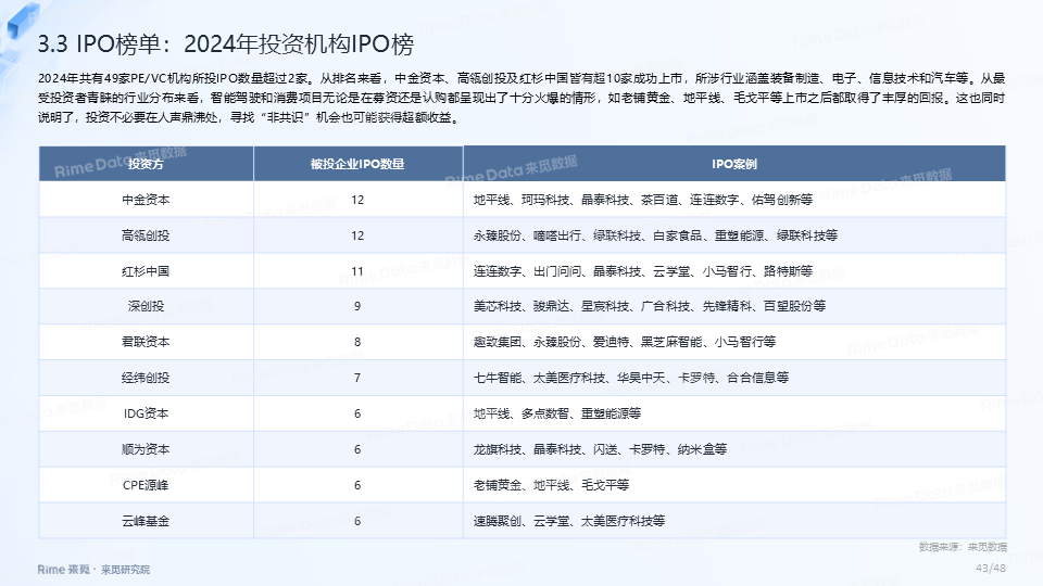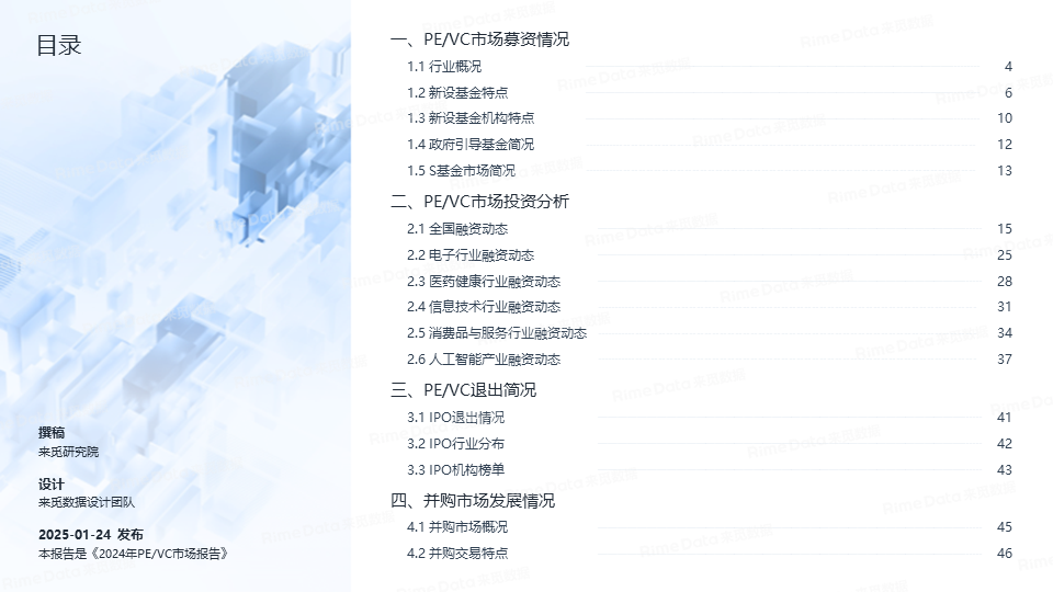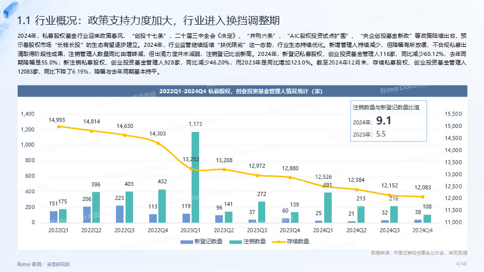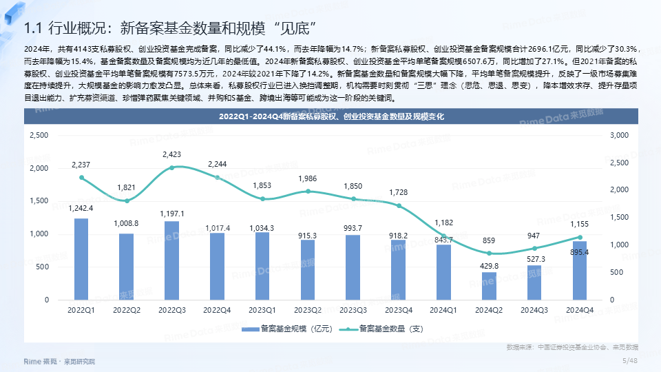 整体而言,2024年私募股权基金行业虽然募投两端都依惯性延续下跌的态势,但两者降幅已明显放缓,基本已处在止跌回稳的关键节点。并且,2024年是私募股权基金行业政策春风年,“创投十七条”、二十届三中全会《决定》、“并购六条”、“央企创投基金新政”等政策陆续出台,股权市场“长钱长投”的生态有望逐步建立。岁序更新,新景日臻。2025年会是私募股权基金行业的小寒春天,虽然依旧会有些寒风和挑战,但穿越过后更多的是阳光和机遇。