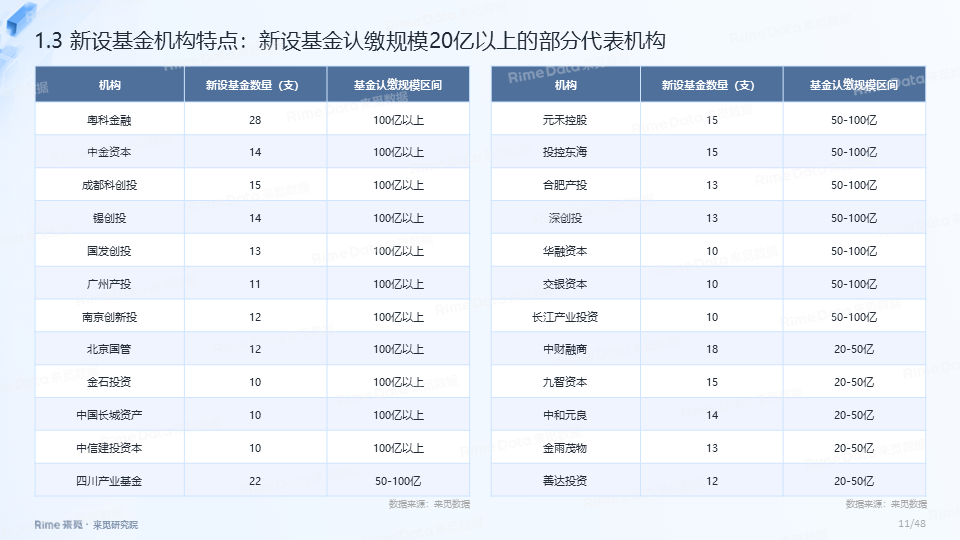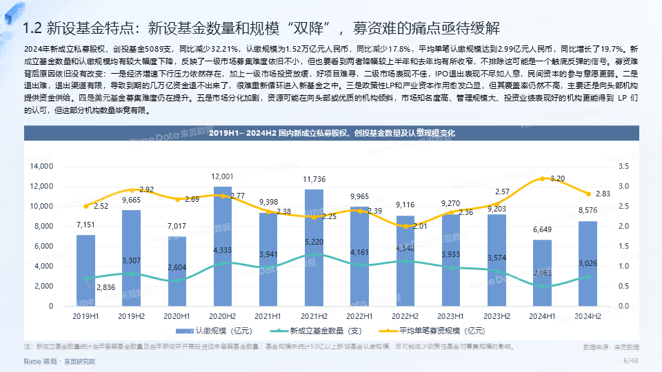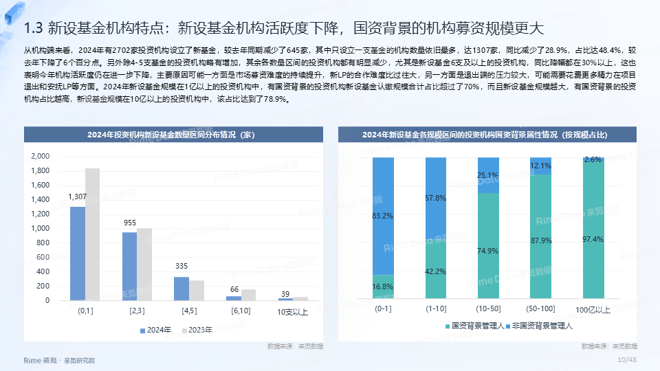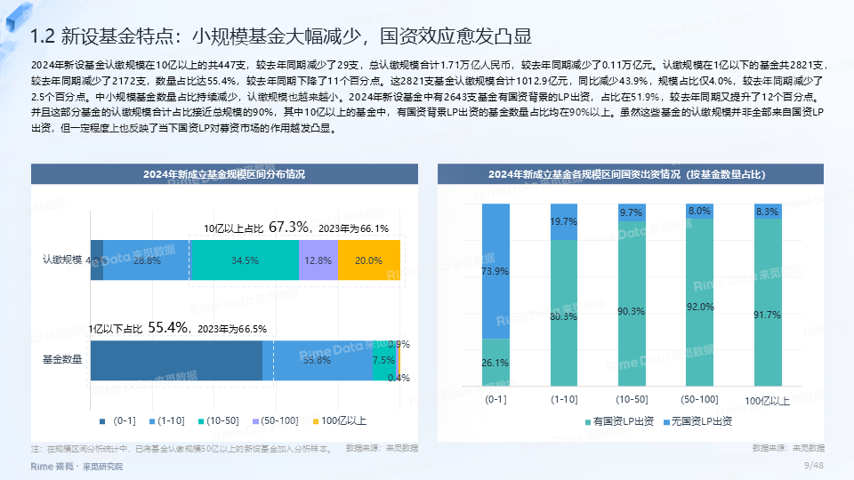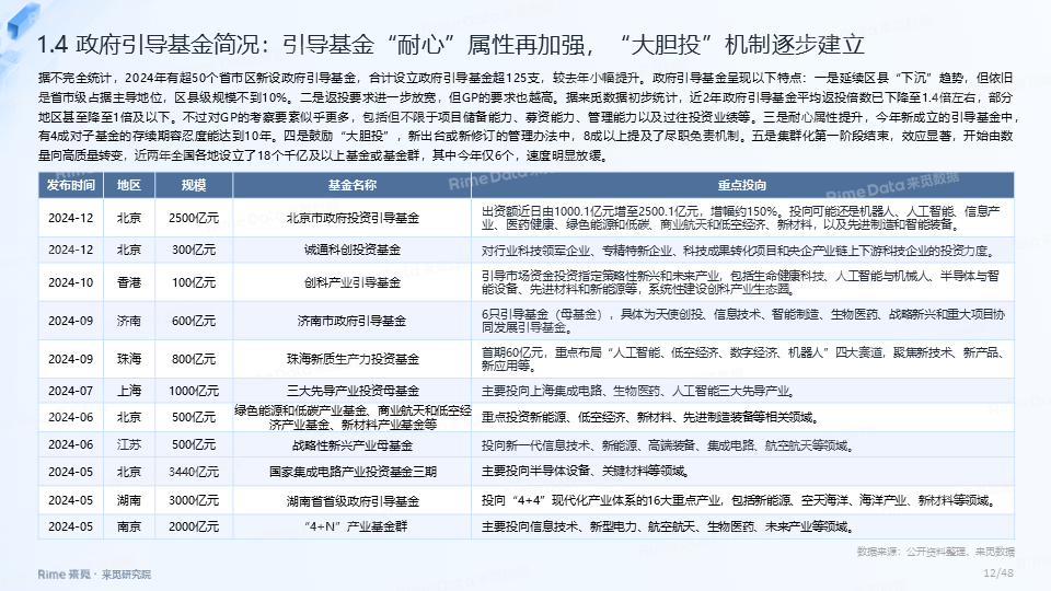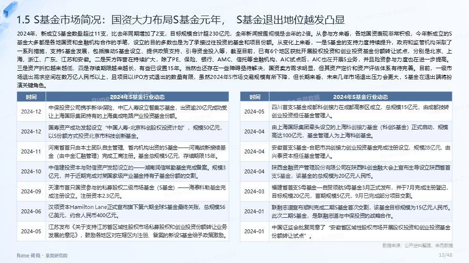 大规模基金占比持续提升,国资效应愈发凸显,2024年新设基金认缴规模在10亿以上的共447支,其中有国资背景LP出资的基金数量占比均在90%以上。2024年省市区合计设立政府引导基金超120支,仍延续区县“下沉”趋势,引导基金“耐心”属性加强,“大胆投”机制逐步建立。此外,S基金市场依旧活跃,国资大力布局S基金,2024年新成立S基金数量超过11支,目标规模合计超230亿元。