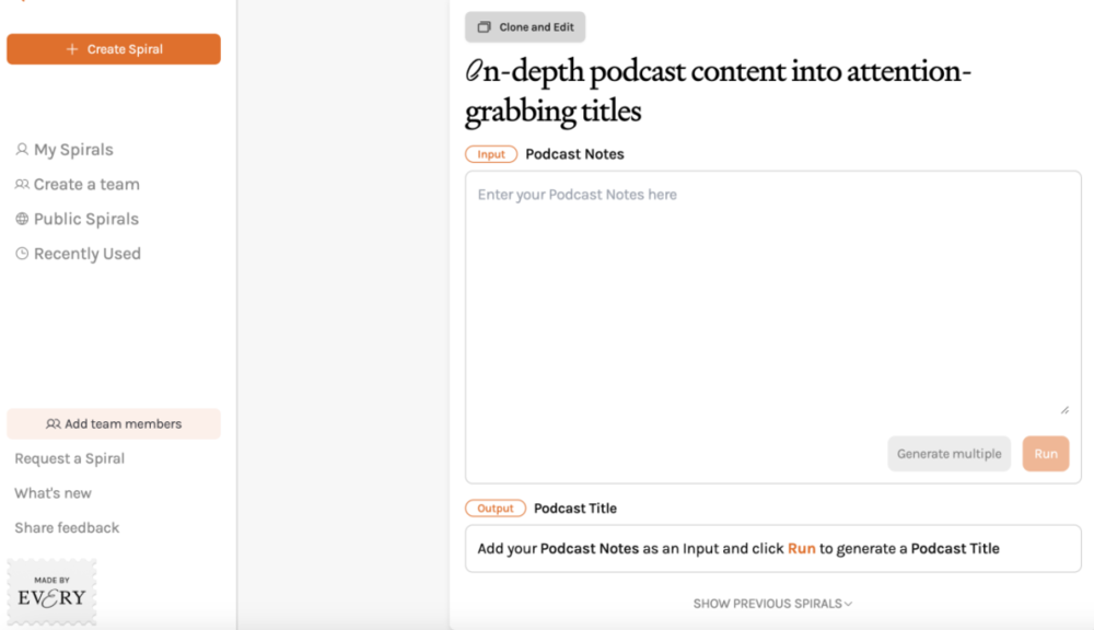 主要功能:Spiral是一款针对重复性写作的AI工具,在使用时,用户需要提供一段内容,AI可以将内容改写成特定风格、结构、语气的内容,比如用户提供播客大纲,让Spiral来撰写文字摘要或相关社媒推广内容。Spiral的目标人群是内容创作者、营销人员等需要大量处理文字内容的用户。