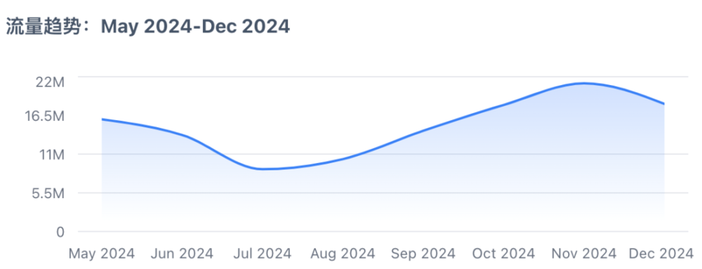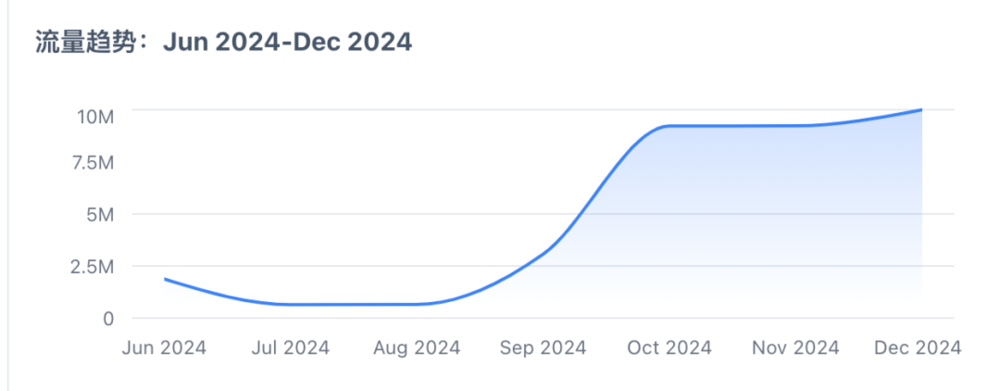 NoteBookLM在2024年9~10月这个区间有一波流量的快速增长,截至12月份,其流量已经触及千万大关。