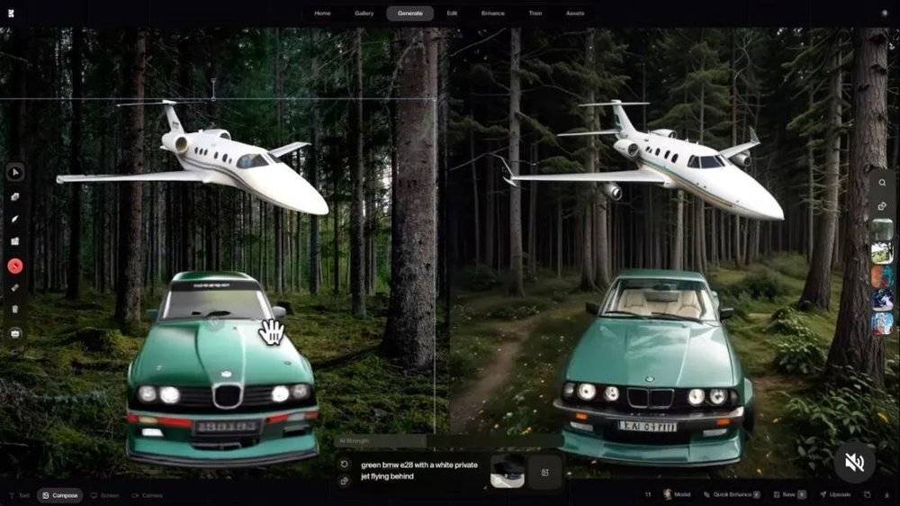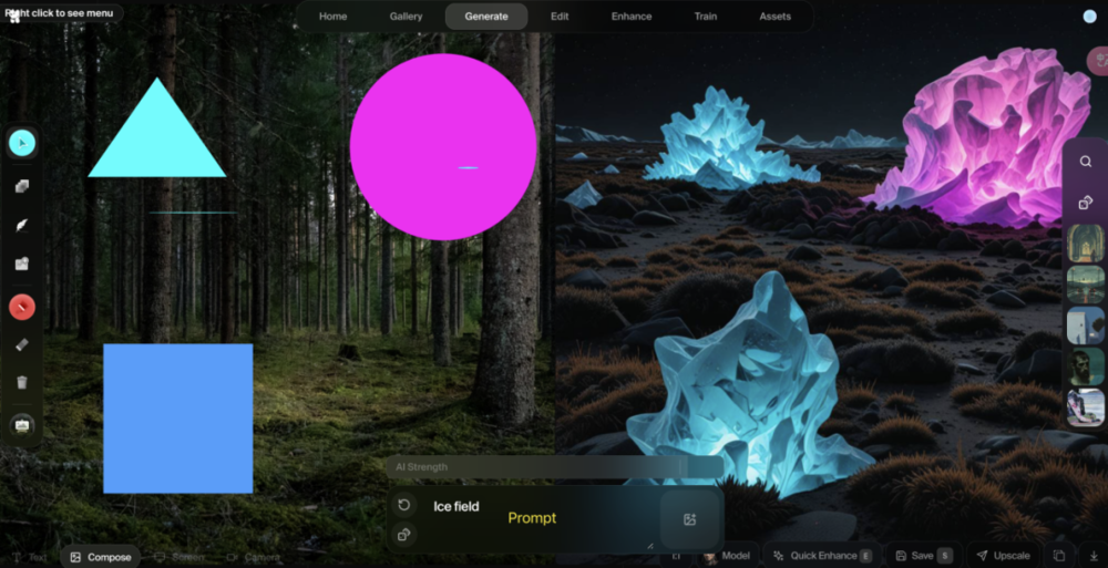 Krea最有特色的功能是“实时生图”,如上图所示,用户在输入Prompt之后,还能通过在左侧图片上增加不同颜色和形状的图形,来更稳定地控制生成图片中各个物体的颜色,位置,相对关系等等,给生图增加更多的确定性。除此之外,Krea还有文生图、物体与背景相融合、文生视频等其他功能。