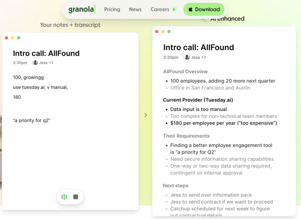 主要功能:Granola是一款AI会议纪要工具,当用户进行线上会议时,它可以进行会议的逐字记录,也可以基于会议内容生成简短的会议纪要,并且将常用的会议纪要模版保存下来,以备后续使用。