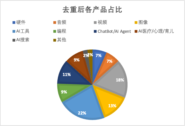 4. 其他占比超过10%的产品类型有AI ChatBot/Agent和AI图像,也是之前就很热门的AI赛道。但是我们还能看到,像AI编程、AI心理/医疗/育儿等垂类行业/场景也开始涌现出不少产品,开始被从业者们所关注。