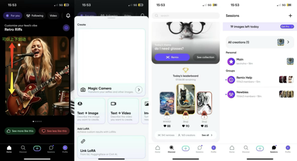 Remix与其他产品都不同,它的主阵地不在Web端而在App端,在基础的图文生图像/视频和图片风格化等基础功能外,Remix拥有比较完善的社区功能,包括可以上下划动的内容分享页面,完善的作品排名和搜索功能,以及聊天/群组等功能。在web端做生图社区的很多,但是在App端,还以TikTok滑动卡片做信息流的,Remix应该是独一份。
