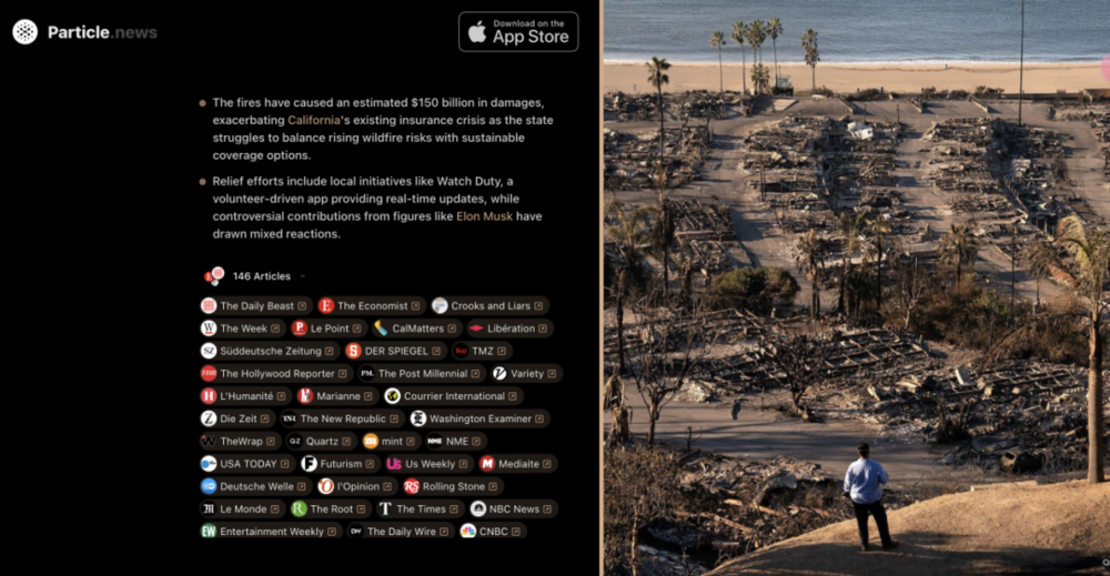 主要功能:Particle.news是一款AI新闻阅读应用,开发者是前Twitter工程师。Particle会按照每日的重大新闻事件,将各个新闻媒体的报道整合起来,并给出摘要和相关出处,尽量为用户提供全面的视角,此外,App端的Particle还提供AI问答、媒体政治倾向标注、语音朗读等更多功能。