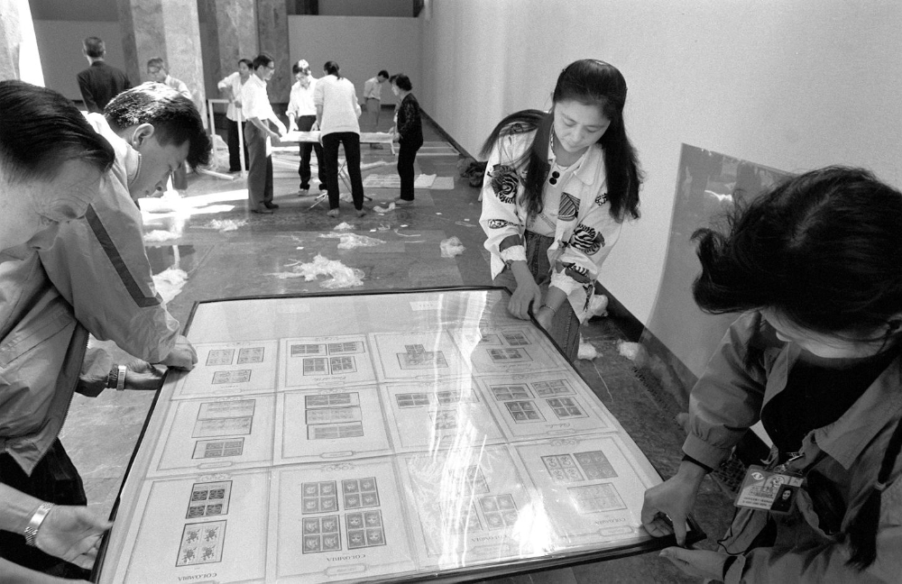资料图:1990年9月18日,第11届亚洲运动会国际体育集邮展览正在北京历史博物馆筹备。新华社记者 刘宇 摄