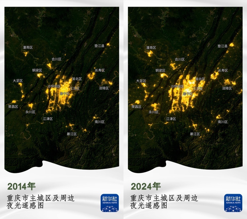 遥感卫星捕捉的城市夜光图,直观展示城市灯光的亮度、密度,记录城市规模不断扩展的痕迹。十年来,山城重庆夜间灯光面积明显扩大,主城区、渝东北三峡库区和渝东南武陵山区的夜间灯光逐渐融成一片,曾漆黑一片的连绵山区里也有了星光点点。