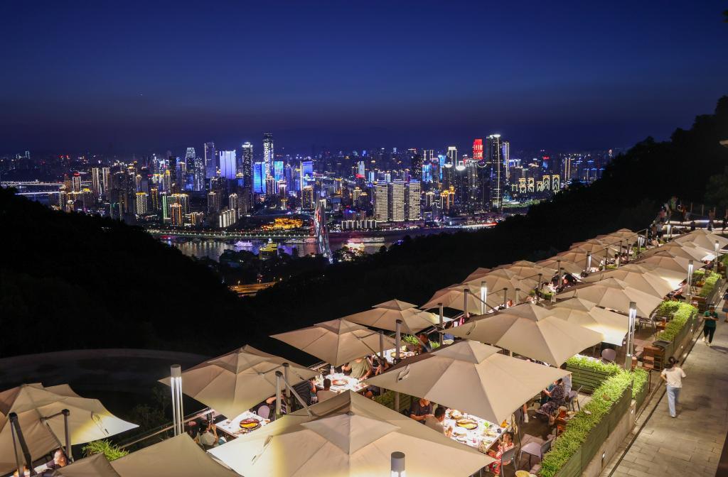 2024年8月23日,重庆南岸区南山风景区内一家网红火锅店内,游客们一边品尝火锅,一边欣赏重庆迷人的夜景。新华社记者 刘潺 摄