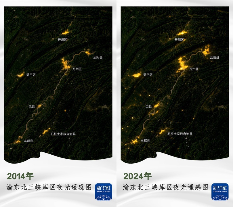 十年后,渝东北三峡库区崛起万州、开州、云阳等几大城镇群,灯光范围向周边川陕鄂省份扩散。