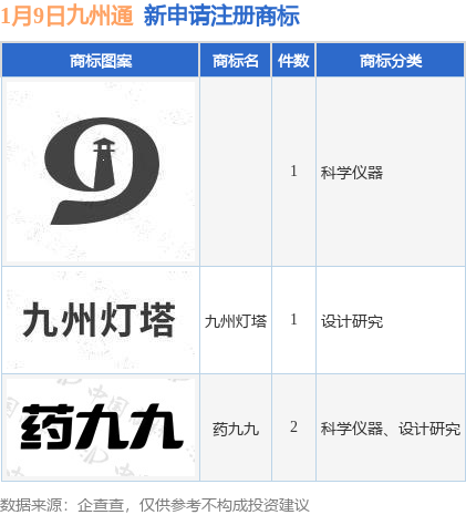 今年以来九州通医药集团股份有限公司新申请注册商标4件,截止目前公司共持有注册商标1244件,另有90件商标尚在注册申请中。