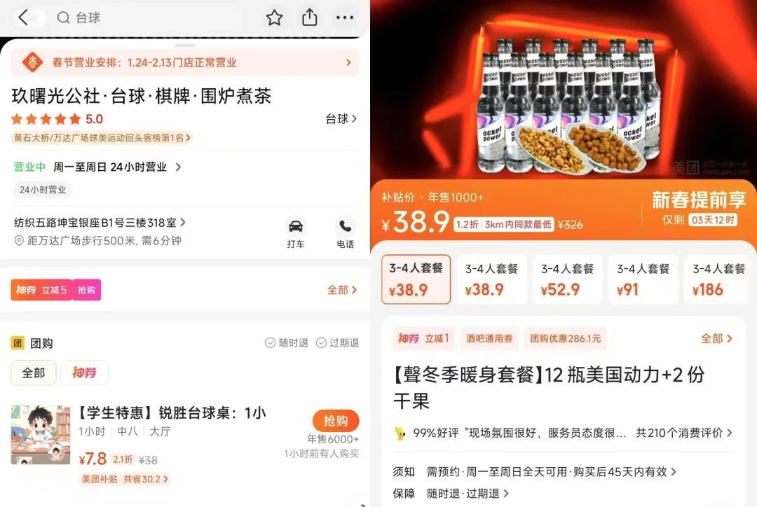惊蛰研究所注意到,目前团购平台上不少商家为了迎接春节销售旺季,纷纷喊出“春节不打烊”的口号,有的还推出“春节特惠”折扣。例如游戏厅上线了9.9元20枚游戏币的特价团购,台球厅推出了9.9元1小时的团购券,KTV也有9.9元欢唱1小时的特别优惠。