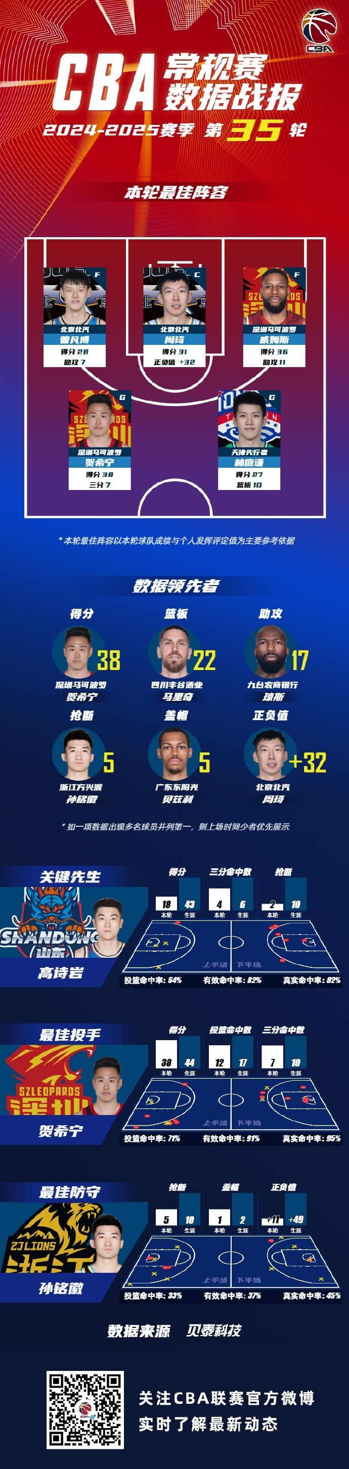 第35轮最佳投手由来自深圳男篮的贺希宁获得;