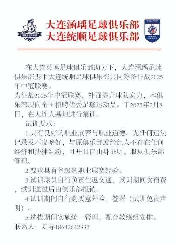 在大连英博足球俱乐部助力下,大连涵瑀足球俱乐部携手大连统顺足球俱乐部共同筹备征战2025年中冠,现发布试训公告。