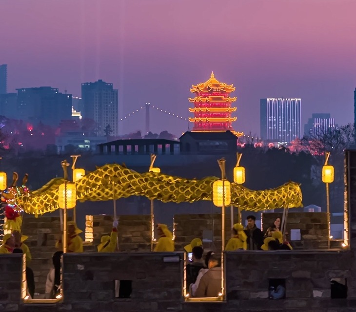 城墙、鱼灯舞龙与黄鹤楼三景同框。图/受访者提供