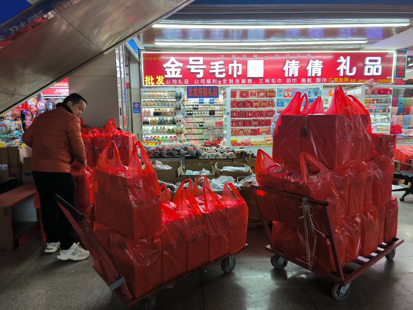 在另一家主营礼品、拖鞋、服饰的店铺前,记者目睹了老板用拖车给上百件商品打包、发货。他告诉记者,这些是别人预定的婚礼伴手礼,总共是450份,现在准备将它们装车发货。