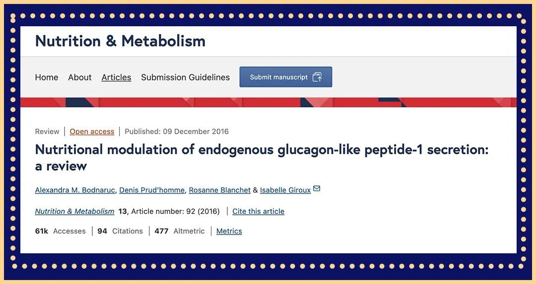 1、Bodnaruc AM, Prud'homme D, Blanchet R, Giroux I. Nutritional modulation of endogenous glucagon-like peptide-1 secretion: a review. Nutr Metab (Lond). 2016 Dec 9;13:92. doi: 10.1186/s12986-016-0153-3IF: 3.9 Q2 . PMID: 27990172; PMCID: PMC5148911.