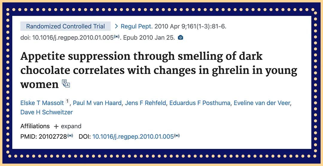 2、Massolt ET, van Haard PM, Rehfeld JF, Posthuma EF, van der Veer E, Schweitzer DH. Appetite suppression through smelling of dark chocolate correlates with changes in ghrelin in young women. Regul Pept. 2010 Apr 9;161(1-3):81-6. doi: 10.1016/j.regpep.2010.01.005. Epub 2010 Jan 25. PMID: 20102728.
