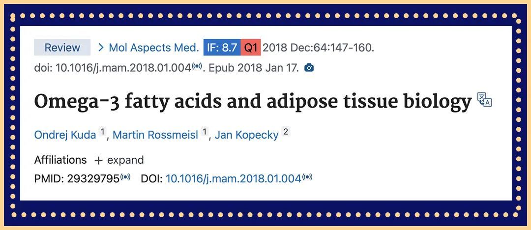3、Kuda O, Rossmeisl M, Kopecky J. Omega-3 fatty acids and adipose tissue biology. Mol Aspects Med. 2018 Dec;64:147-160. doi: 10.1016/j.mam.2018.01.004. Epub 2018 Jan 17. PMID: 29329795.