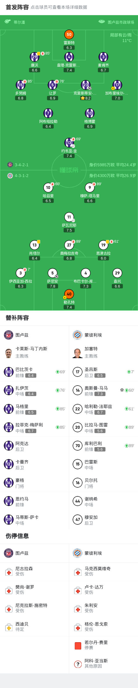 在法国足球顶级联赛第19轮的较量中,图卢兹坐镇主场迎战蒙彼利埃。比赛中,图卢兹的克里斯蒂安-卡塞雷斯在队友约书亚-金的助攻下成功破门,为主队取得领先。然而,蒙彼利埃迅速做出回应,萨尼安为球队扳平比分。随后,萨瓦尼耶为奥斯曼-马马送出精准助攻,后者将球送入网底,帮助蒙彼利埃反超比分。最终,蒙彼利埃以2-1的比分战胜图卢兹,取得了比赛的胜利。