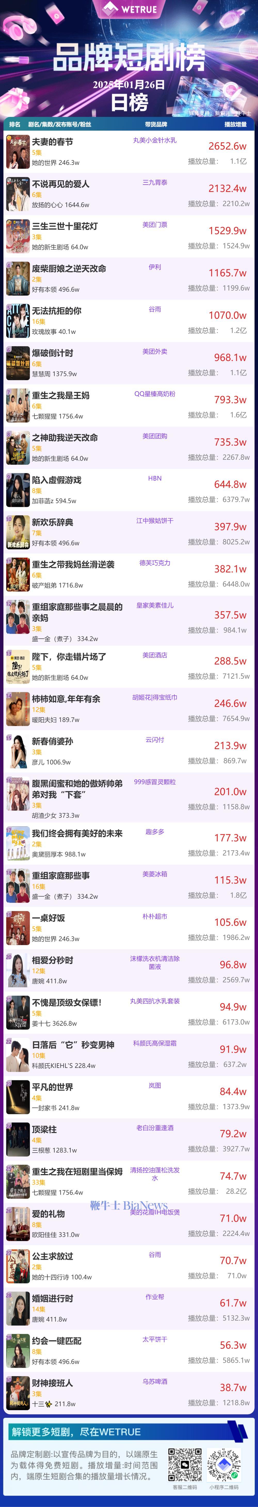 1月27日消息,为帮助短剧从业者提供更多信息,专注于短剧报道的新腕儿和科技媒体鞭牛士联合WETRUE短剧热度榜共同推出多种短剧热度榜。