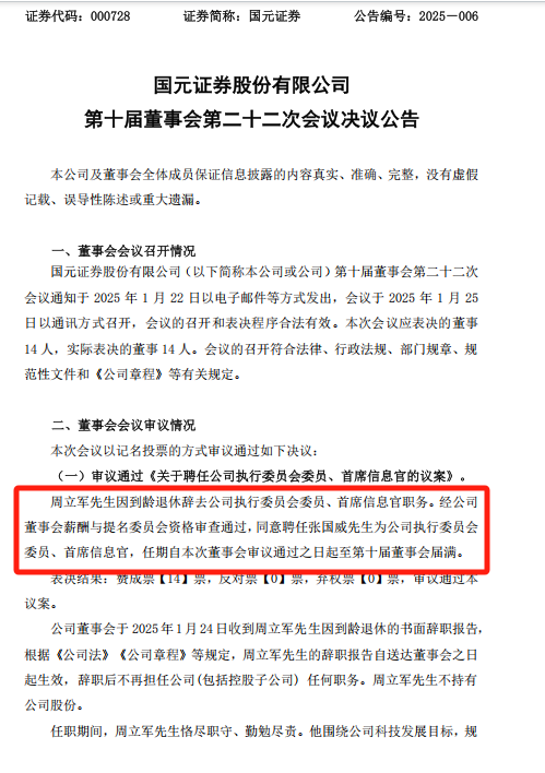 1月26日,国元证券发布公告,聘任张国威为公司执行委员会委员、首席信息官,聘任黄越为公司执行委员会委员;周立军因到龄退休辞去公司执行委员会委员、首席信息官职务。