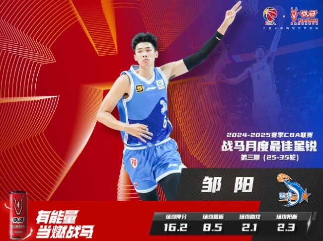 北京时间1月27日,CBA官方宣布,福建男篮球员邹阳荣获2024-2025赛季战马第3期月度最佳星锐球员。