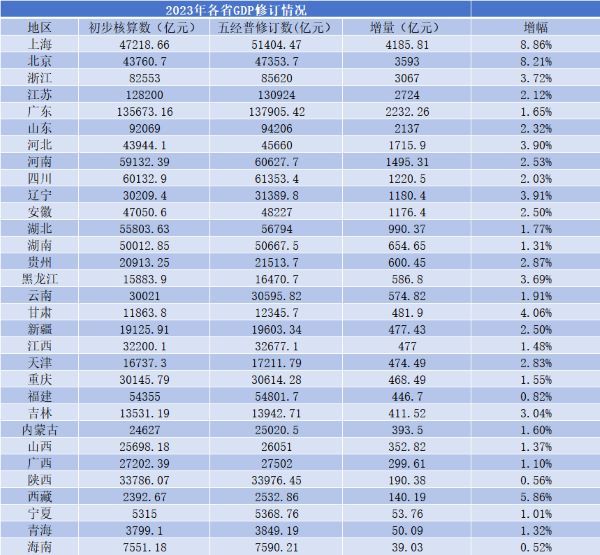 近日,全国31个省份陆续发布2024年经济运行情况,同步也发布了五经普后各省份2023年GDP修订数据,从这些数据来看,全国31个省份2023年的GDP都被不同程度地调增,上海和北京的调增量相对较多。