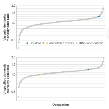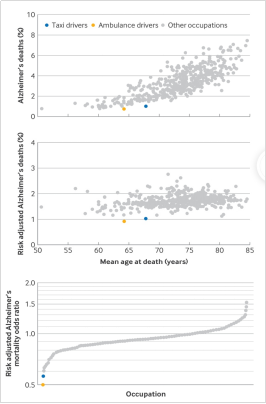 随后,研究人员分别对死亡年龄、性别、种族、族裔和受教育程度进行了调整,在纳入考虑的443种职业中,经调整后阿尔茨海默病死亡率最低的两种职业是:救护车司机和出租车司机。同样,在所有职业中,出租车司机和救护车司机经调整后的阿尔茨海默病死亡风险比也是最低的。