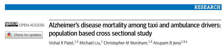 不仅如此,最新的研究还表明,拥有“出色的驾驶技术”对健康同样有益。近日,哈佛大学医学院的研究人员在国际医学顶刊BMJ发表一篇题为“Alzheimer’s disease mortality among taxi and ambulance drivers: population based cross sectional study”的研究论文,该研究通过对443种职业中阿尔茨海默病发生风险的评估,发现出租车司机和救护车司机这类需要高度导航记忆的职业,在所有职业中的阿尔茨海默病死亡率最低。
