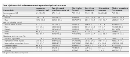 该研究总共确定了8972221名有职业信息的死者,按职业群体划分的人群测量特征显示,在选定的需要导航的职业中,救护车司机的平均死亡年龄最低,为64.2岁,出租车司机为67.8岁。除公交车司机的性别比例更为均衡外,这些从事导航相关职业的从业者大多为男性。除飞机飞行员受教育程度较高外,大多数导航相关职业从业者都只有高中及以下学历。