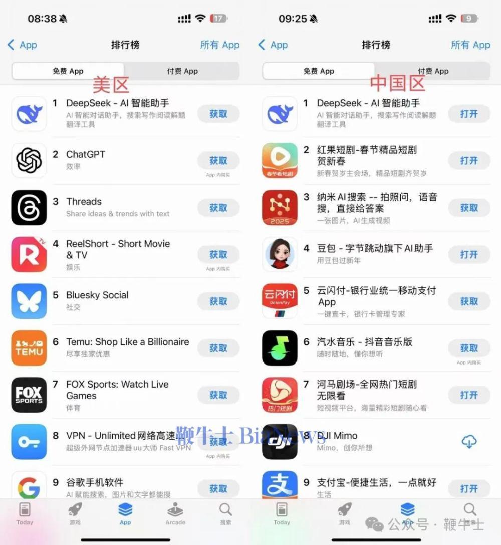 1、DeepSeek同时登顶苹果中美两区App免费榜