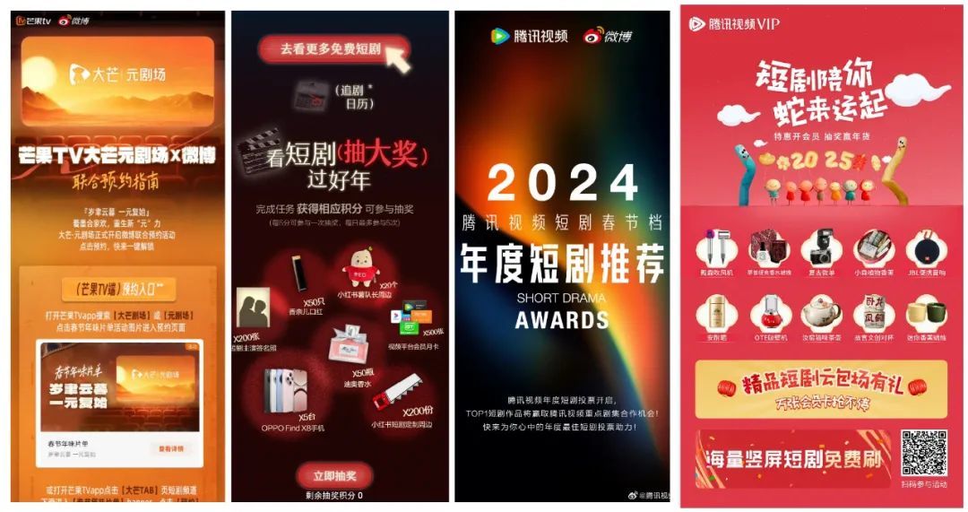 芒果和腾讯则主打外部联动,进行跨平台合作撬动外部用户流量。芒果TV今年在大芒·元剧场首创了站内外同步联合预约的新玩法,腾讯视频也增加了与新浪微博联手开展了“2024腾讯视频年度短剧推荐”活动。