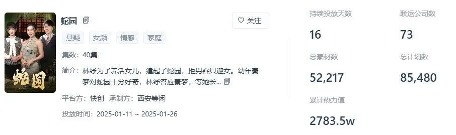 例如,悬疑短剧《蛇园》累计热力值超2700万,素材量超5.2万组。就是借用民间故事“人形蛇”“美女蛇”等创作切片素材,吸引观众注意力。