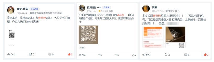 除了活动更丰富外,对于春节档的预热战线和营销周期也更长。剧查查社区内最早从11月19日起,麦芽就开始发布收春节档剧本的帖子,着手春节档。12月起,各承制方开始启动春节档短剧的制作。投放平台方中最早开始春节档活动的是拼多多,12月30号就面向短剧生产方推出流量激励政策,积极收剧,增加存量。