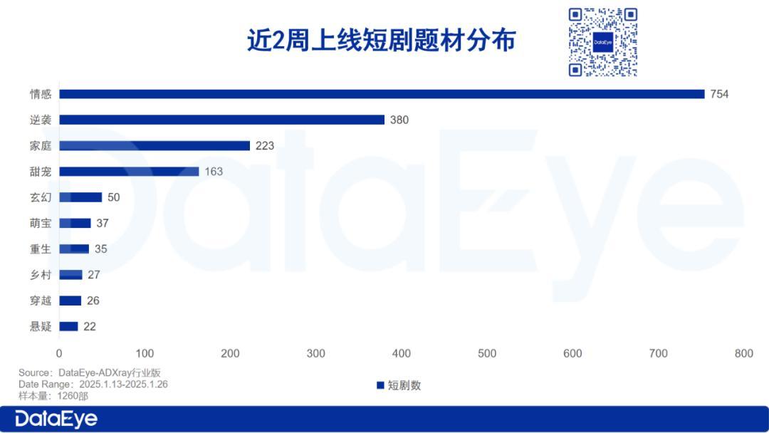 而从细分题材来看,情感题材最多,占比过半,其次是逆袭、家庭题材居多,分别占380部和223部。