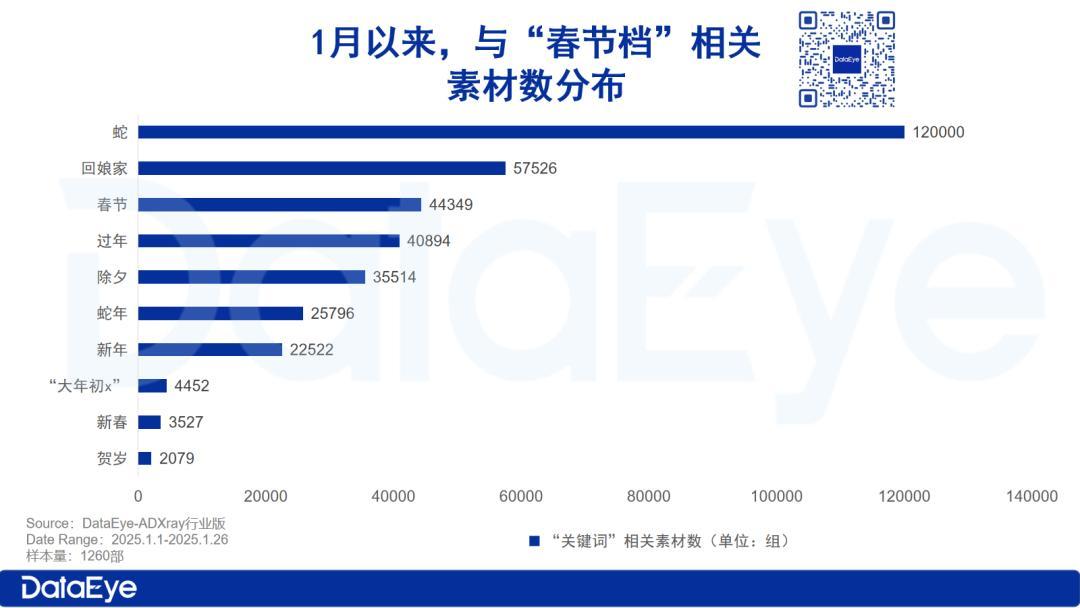 DataEye短剧观察在DataEye-ADXray行业版后台进行关键词搜索,1月1号以来,与“蛇”元素相关的素材最多,有超过12万组,主要是受爆款短剧《蛇园》的影响,《蛇园》素材数占5.2万组。