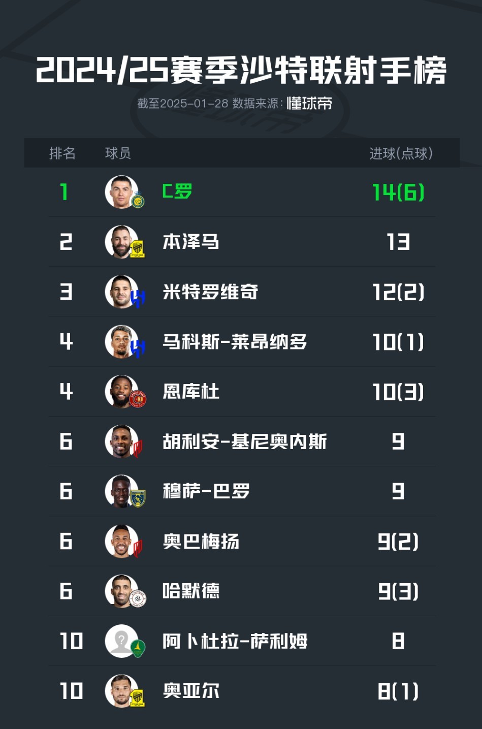 北京时间1月28日凌晨,沙特联赛结束了第17轮的全部争夺,这也意味着2024-25赛季的半程已过。而在射手榜上,年近40岁的C罗仍然领跑,他在皇马的老队友本泽马排名第二,曾在中超效力过的哈默德上榜。