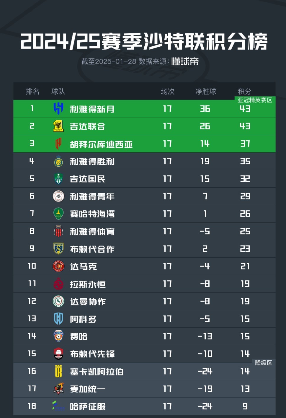 北京时间1月28日凌晨,沙特联赛结束了第17轮的全部争夺,这也意味着2024-25赛季的半程已过,积分榜也随之更新。