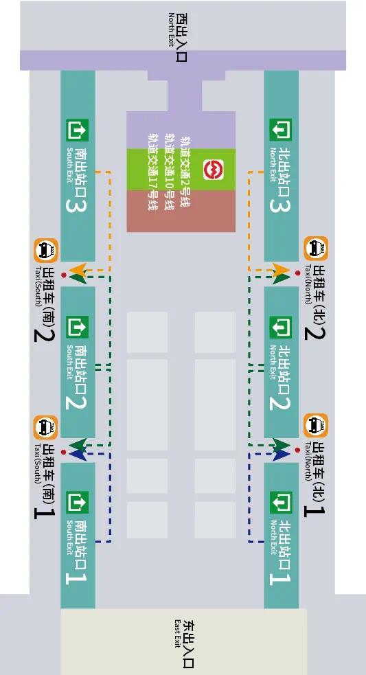 从南出站口3、北出站口3出来的旅客,可选择在出租车南2、出租车北2乘坐出租车。